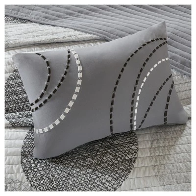 The Madison Park Cabrillo Complete Reversible Coverlet and Cotton Sheet Set brings a clean, modern update to your bedroom. A geometric print of dark, white, and light grey circles covers this soft microfiber coverlet, for a refreshing allure. Matching shams (1 for Twin Sizes) repeat the design on the coverlet, while an embroidered decorative pillow provide the finishing touches. Also included is a complete cotton sheet set with a coordinating geometric print. Bringing the best in health and wellness, this bedding set also features an anti-microbial treatment that provides built-in freshness protection, reducing the growth of odor causing bacteria and keeps fabric lasting longer. This bedding set is also OEKO-TEX certified, meaning it does not contain any harmful substances or chemicals, ensuring quality comfort and wellness.