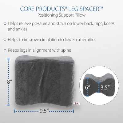 The Leg Spacer is designed to help relieve pressure and strain on the lower back, hips, knees and ankles. Our spacer fits comfortably between your legs and keeps them in alignment with your spine. Helps to relieve pressure on joints and improve circulation to lower extremities. The special contoured design stays in place and moves with you without the need for straps. Made of precision cut, high quality foam covered in a gray fabric. Cover is removable and hand-washable. Standard 10 x 8 x 6 inches. Petite 9 x 6.5 x 5.5 inches.